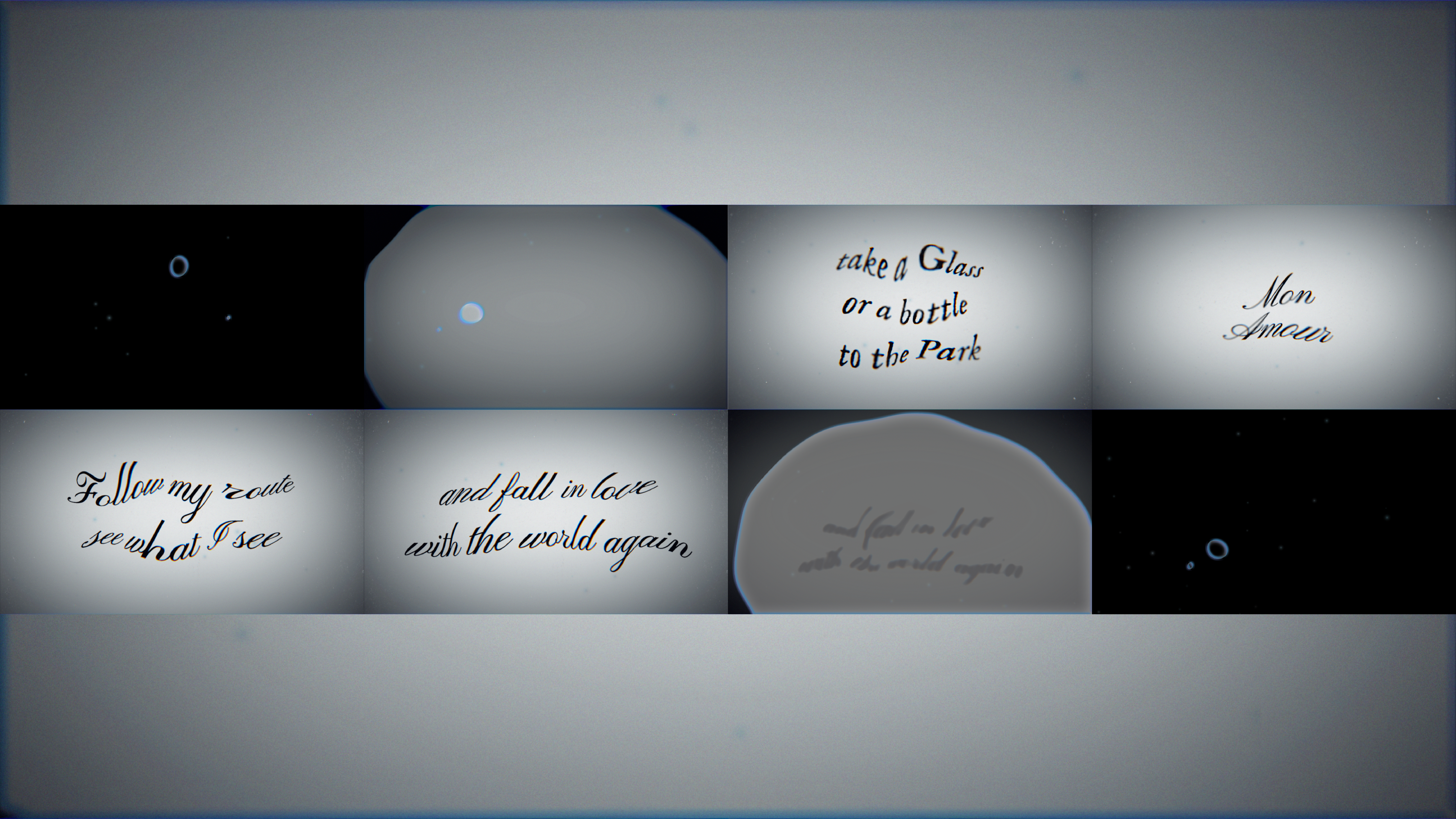 A Drifting Invitation was inspired by my memories of traveling in Paris and Berlin. Its motion language comes from a matcha pond in Tiergarten filled with birdsong, which led me to imagine text slowly rising from underwater. The opening sign, “Take a glass or a bottle to the park,” was adapted from a wine shop sign I encountered in Berlin.